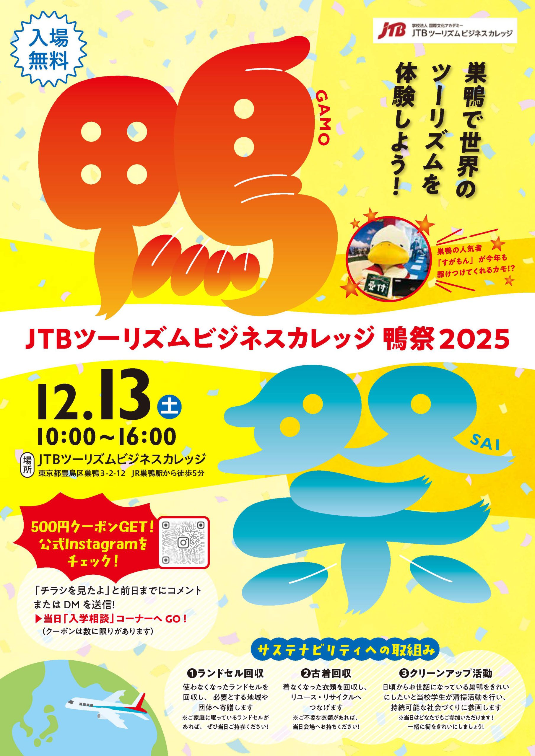 2025年度の学園祭『鴨祭』を2日間 にわたり開催いたします!!学生たちが主体となって現在企画・準備中♪表現力を発揮する場としてステージパフォーマンスや様々なテーマにちなんだツーリズムブースをご用意。ぜひ足をお運びいただき、学生たちの熱意と笑顔あふれる学園祭をお楽しみください☆